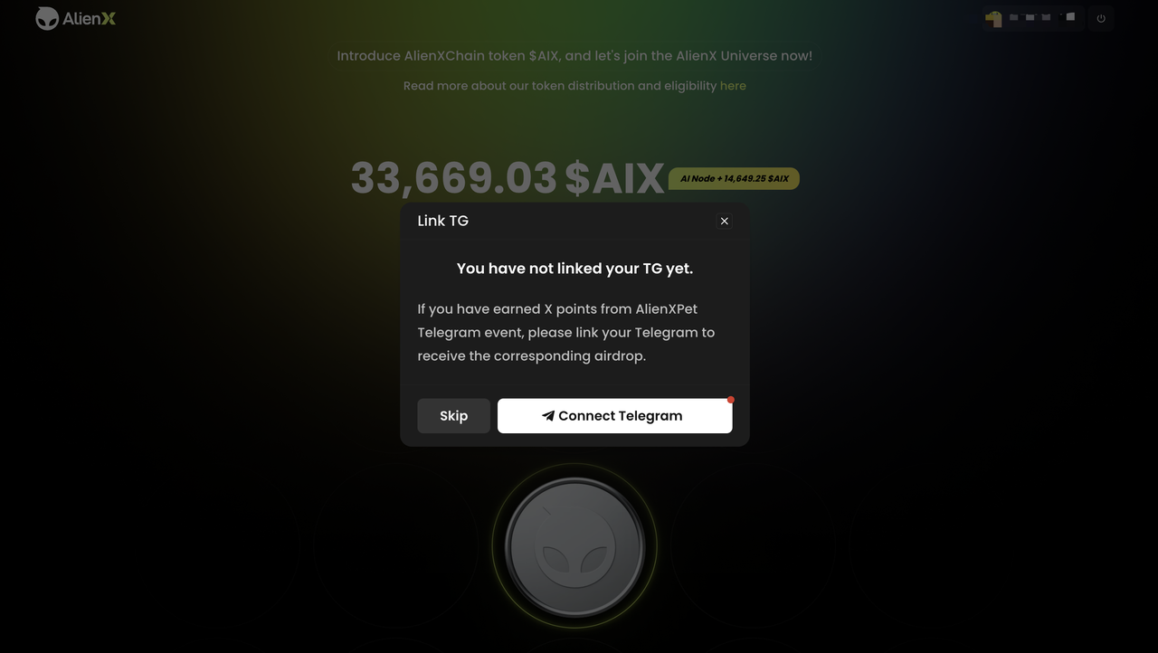 **Step4:** Back to the page, click the "Claim" button and link to your Telegram. Please make sure that you linked the right Telegram if you have joined the ALIENX Pet TG Bot event before. Or you can just skip that and link it to your wallet to confirm token claiming.
