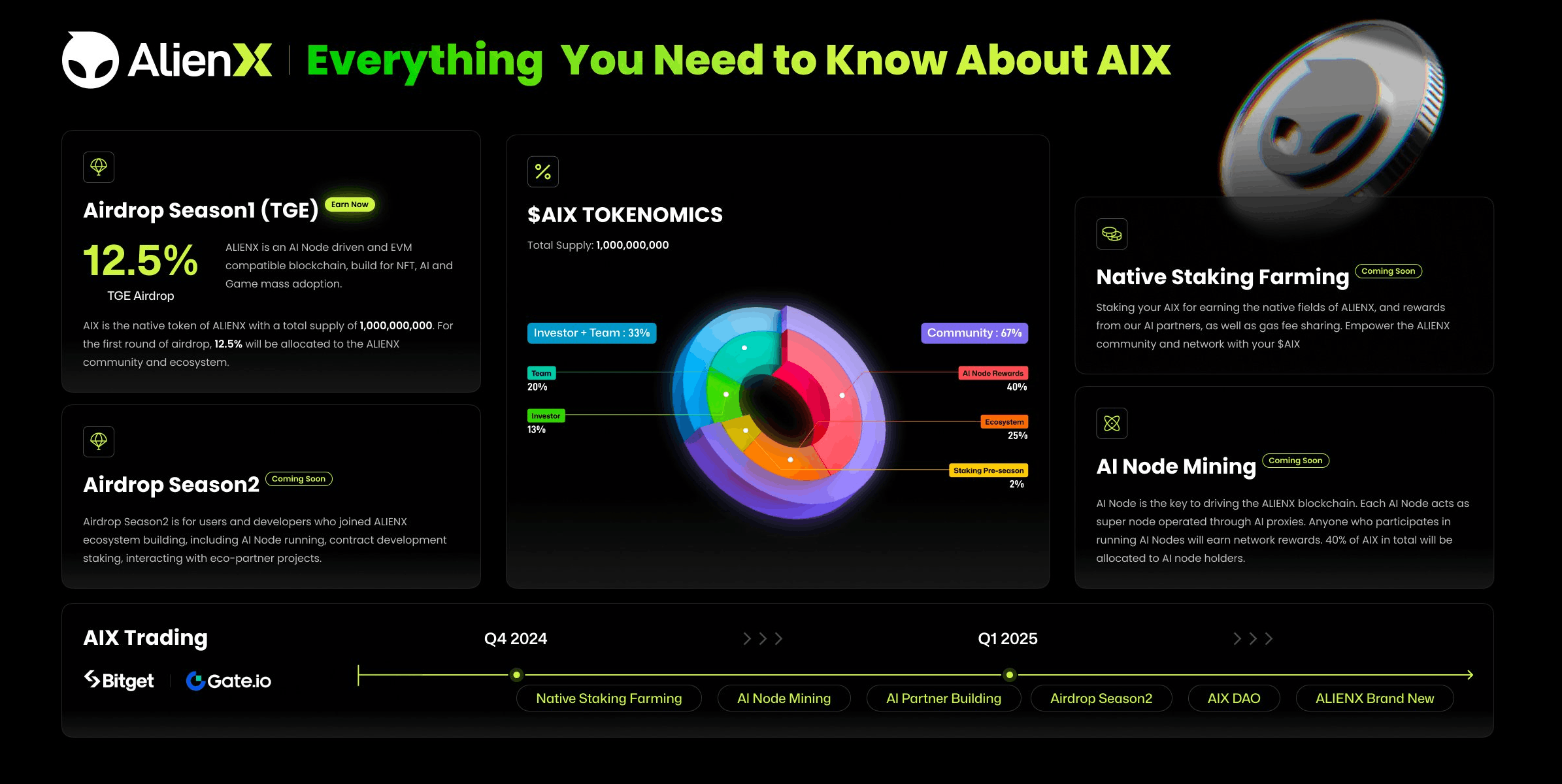 AIX DAO governance will open soon after, serving as a bridge between the community and ALIENX. Airdrop Season 2 is for users and developers who joined ALIENX ecosystem building, including AI Node running, staking, and engagement with eco-partner projects.